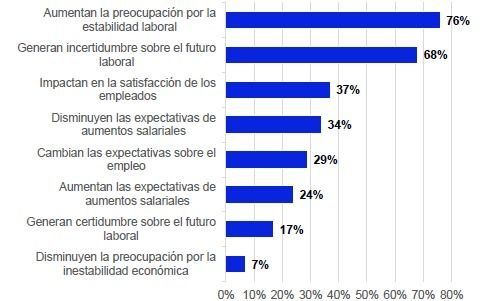 El informe también destacó que el 76% de los profesionales identificó un aumento de la preocupación por la estabilidad entre los empleados, mientras que el 68% señaló un crecimiento de la incertidumbre sobre el futuro laboral.