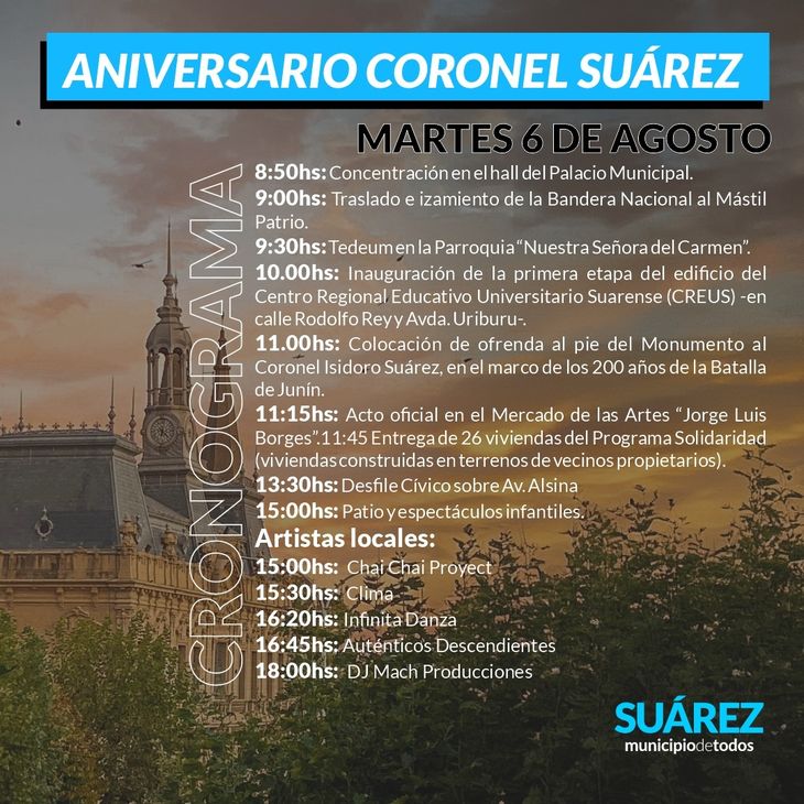 El comunicado oficial informó que los afortunados del flamante asueto serán los ciudadanos de la ciudad bonaerense de Coronel Suarez. Se conoció que la cabecera del partido homónimo celebrará un nuevo aniversario de su fundación, con motivos de expandir el territorio criollo en medio de la Conquista del Desierto en 1882.
