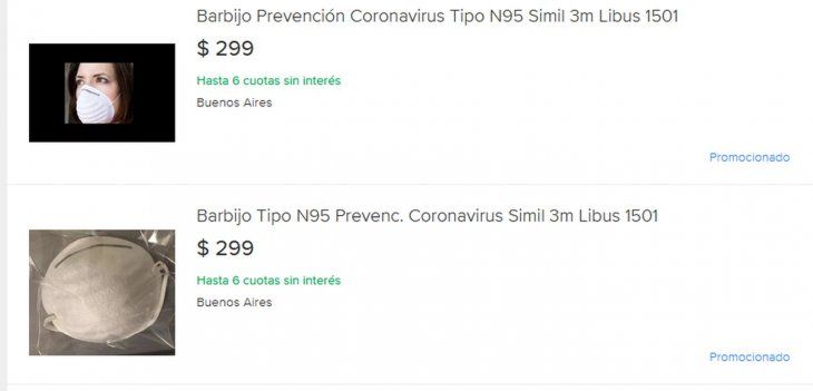 Otro de los elementos más buscados es el barbijo. Este insumo sólo está indicado en personas con sintomatología compatible con el virus y para personal de la Salud que tenga que atender a personas con coronavirus. Sin embargo, ya son varios quienes venden el producto bajo la leyenda “Prevención Coronavirus”. En Mercado Libre su precio se ubica en torno a los $300.