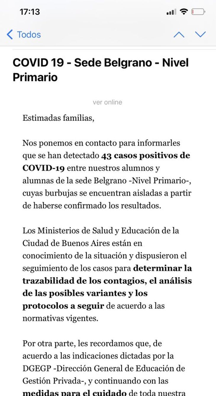 "Nos ponemos en contacto para informarles que se han detectado 43 casos positivos de COVID-19 entre nuestros alumnos y alumnas de la sede Belgrano -Nivel Primario-, cuyas burbujas se encuentran aisladas a partir de haberse confirmado los resultados", indica el texto enviado por mail.