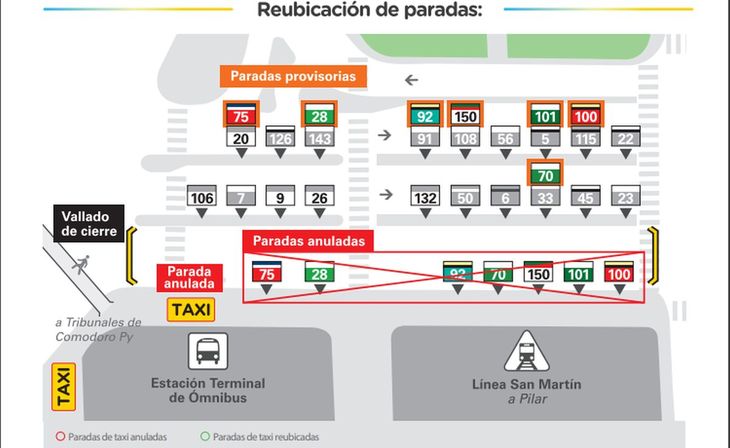 A raíz de las obras, se anularán las paradas actuales de las líneas 28-70-75-92-100-101 y 150 ubicadas sobre José María Ramos Mejía entre av. Antártida Argentina y Padre Mugica. Las mismas se reubicarán sobre los paradores que están ubicados frente a Plaza Canadá: