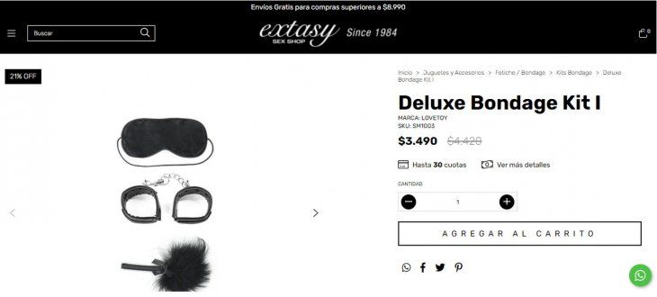 Extasy Sex Shop es uno de los locales que puso sus productos a disposición del Cyber Monday. Con 21% de descuento, Deluxe Bondage Kit I es uno de los productos en oferta que está $ 3.490 y se puede pagar hasta en 30 cuotas. Antes costaba $ 4.420. Contiene 3 piezas: antifaz, esposas y plumita. Y ofrece envío a todo el país y retiro en tienda.