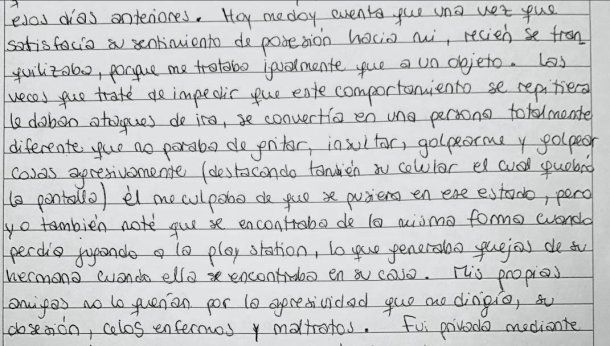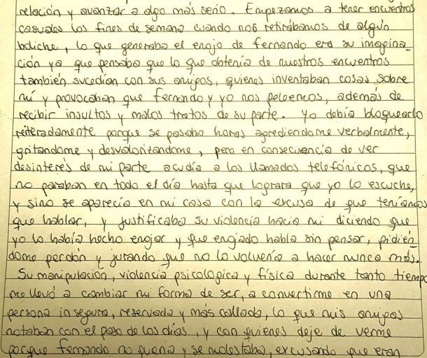 "Ella me contaba que la persona que salió con ella, un chico llamado Fernando, la molestaba, la llamaba, a veces la esperaba a la salida de su casa o de los boliches... y una vez recuerdo que vino toda rasguñada a la sesión y después, en otra sesión, le vi moretones en los brazos... otra vez en la parte baja de la espalda tenía un golpe como del grande de la boca de un vaso", declaró la mujer.