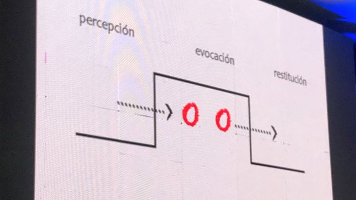 Según definió Boris Mir, la percepción es todo lo que vemos o experimentamos a través de los sentidos, el saber previo que cada individuo posee internamente, sin si quiera saber que lo posee. En tanto la evocación es el ejercicio mental voluntario e invisible que ejecutamos al recordar o traerlo a la mente. Mientras la restitución es el acto de regresar ese conocimiento que se creía oculto al aquí y ahora, a través de hábitos evocativos mentales, en una representación, una imagen mental. “Si yo hablo moviendo los brazos, incluso hablando por teléfono, es un hábito. Y si alguien me agarra de un brazo no puedo hablar”, detalló el académico.