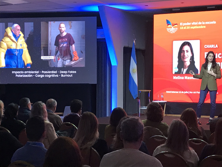La tercera y última jornada comenzó con una presentación de Melina Masnatta, autora, experta en tecnología educativa, emprendedora, consultora en inteligencia artificial, innovación y docencia. “El cuerpo es nuestra primera tecnología, y los que desarrollan tecnología lo saben”, aseguró Masnatta al abrir su exposición titulada “Educar en tiempos sintéticos”.