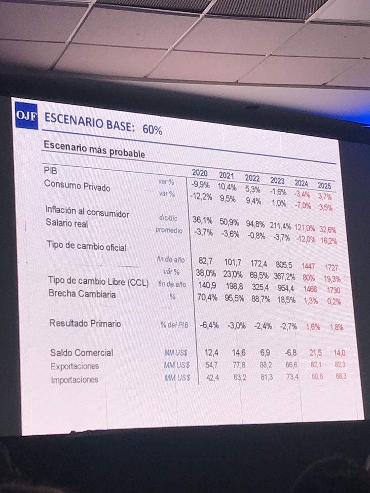 El economista le dijo a los educadores que si se levanta el cepo el tipo de cambio oficial se podría ir a $1.300, con tendencia a la baja y no a la suba, y un límite que rondaría los u$s100.000. Los dólares libres (CCL) irían a $1.447. “Entre $1.100 y $1.400 el tipo de cambio es razonable para la Argentina. Sería muy raro que si se levanta el cepo se vaya a $1.700”, afirmó.