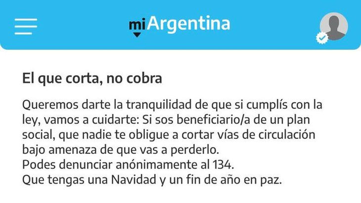 Las palabras de la funcionaria se reflejaron en la aplicación Mi Argentina a través de un polémico mensaje hacia los beneficiarios de planes sociales. “Queremos darte la tranquilidad de que si cumplís con la ley, vamos a cuidarte: Si sos beneficiario/a de un plan social, que nadie te obligue a cortar vías de circulación bajo amenaza de que vas a perderlo. Podes denunciar anónimamente al 134. Que tengas una Navidad y un fin de año en paz”, indica el mensaje.