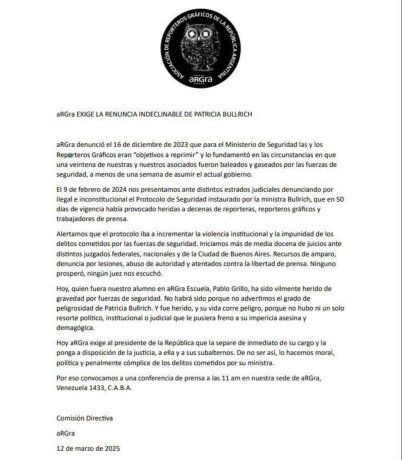 La Asociación de Reporteros Gráficos de la República Argentina (aRGra) exigió en un comunicado la renuncia de la ministra Bullrich. En el texto afirmaron: "Hoy, quien fuera nuestro alumno en aRGra Escuela, Pablo Grillo, ha sido vilmente herido de gravedad por fuerzas de seguridad. No habrá sido porque no advertimos el grado de peligrosidad de Patricia Bullrich. Y fue herido, y su vida corre peligro, porque no hubo ni un solo resorte político, institucional o judicial que le pusiera freno a su impericia asesina y demagógica".