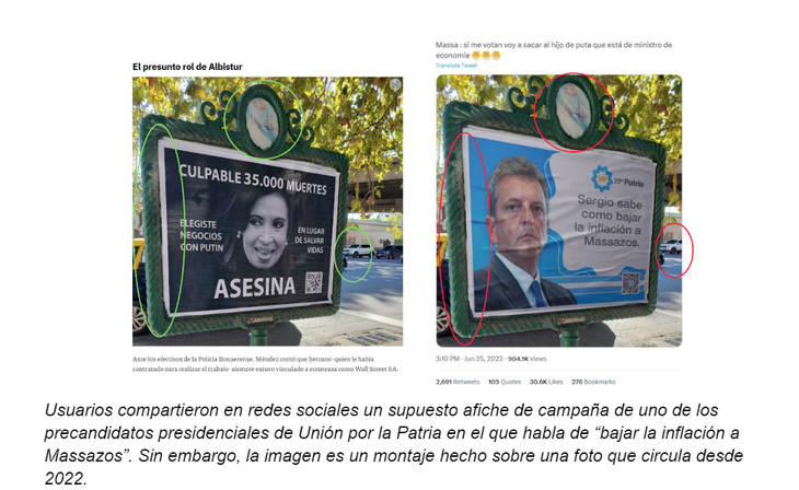 Por ejemplo, circuló la imagen de un supuesto afiche de campaña del precandidato presidencial Sergio Massa (Unión por la Patria), y una búsqueda inversa de la foto no arrojó resultados por fuera de las publicaciones que se viralizaban en redes sociales. Sin embargo, navegando la sección de imágenes de Google a partir de palabras claves -como “afiche”, “calle” y “Buenos Aires”- pudo encontrarse en una nota de abril de 2022 del portal Nexofin la imagen original sobre la que fue hecha el montaje.