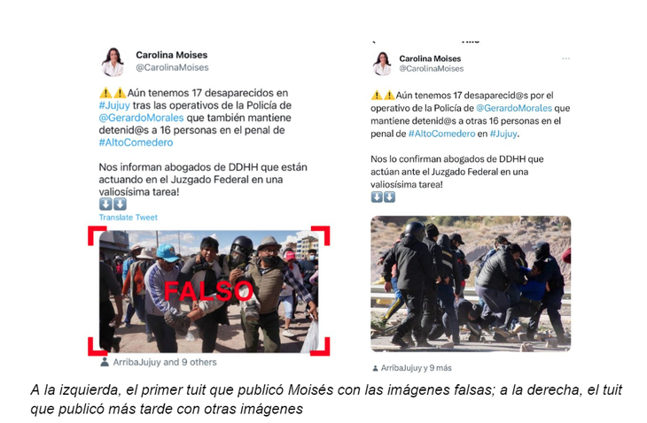 Una búsqueda inversa reveló que una diputada del Frente de Todos de Jujuy, Carolina Moisés, utilizó fotos de una manifestación en Perú para ilustrar el conflicto de su provincia; es decir, desinformó al utilizar fotos tomadas de otro contexto.