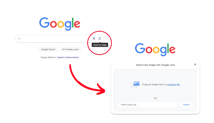 Otra opción es subir la imagen descargada desde la computadora al buscador de Google. Para ello hay que entrar a Google.com y hacer click en el ícono que se encuentra a la derecha de la barra de búsqueda . Ahí se desplegará la opción de arrastrar una imagen desde el escritorio, o subirla como archivo y hacer la búsqueda con Google Lens.