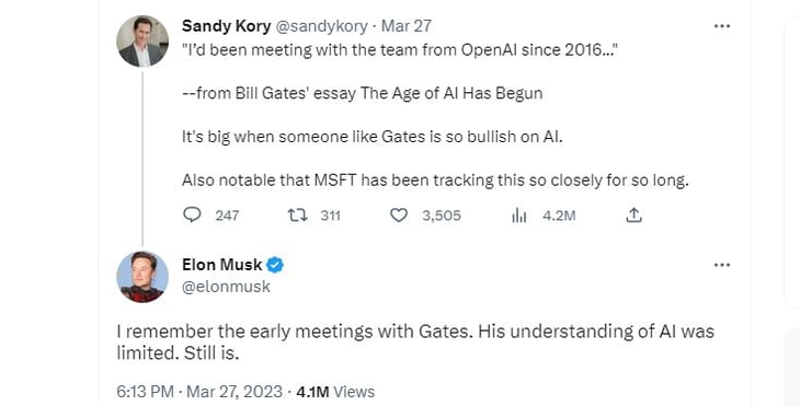 “Recuerdo las primeras reuniones con Gates, Su comprensión de la IA era limitada. Todavía lo es",expresó en una respuesta en la red social de la cúal es dueño.