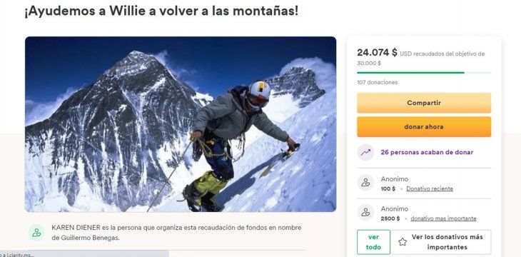 Tras el accidente, la familia lanzó una campaña mediante internet para recaudar fondos y ayudar al montañista a afrontar los gastos de su recuperación. El argentino deberá pasar al menos dos meses en tratamiento y las donaciones se pueden realizar en la plataforma denominada "Go Fund Me".