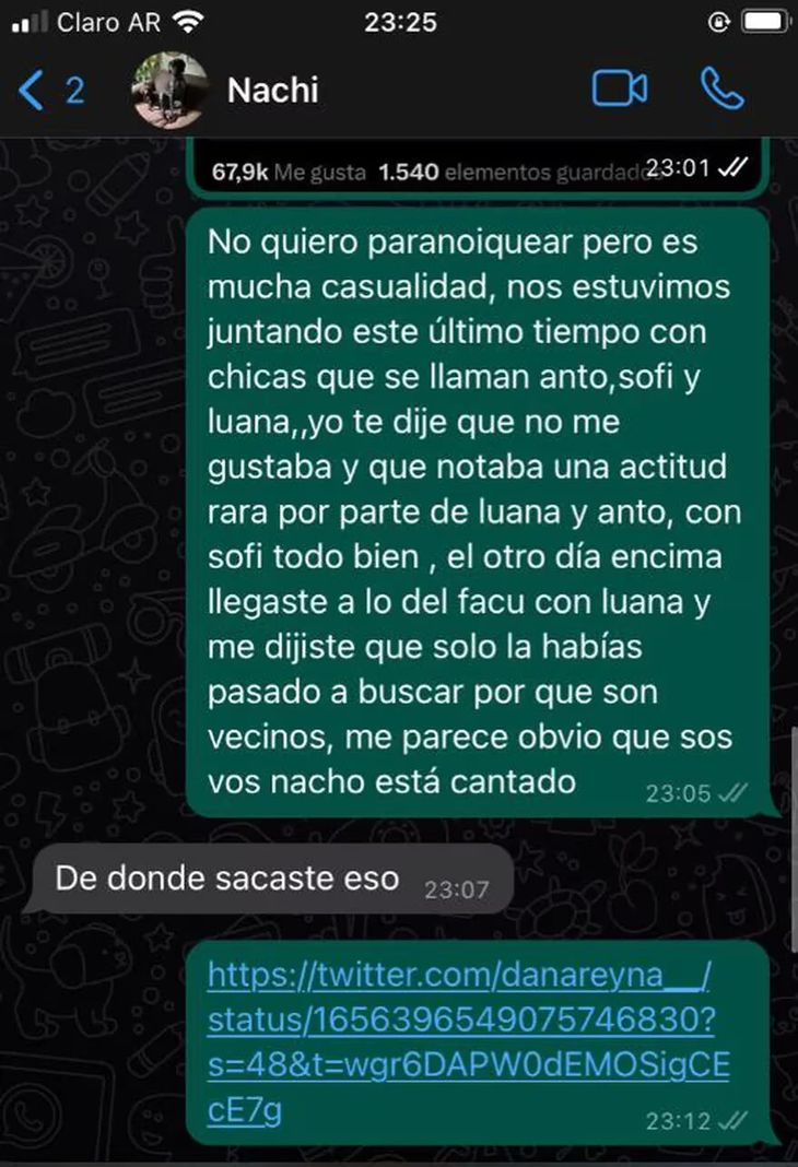 En el chat, Agostina expresa desconfianza por el tuit viralizado y sus similitudes: "No quiero paranoiquear pero es mucha casualidad, nos estuvimos juntando este último tiempo con chicas que se llaman anto, sofi y luana. Yo te dije que no me gustaba y que notaba una actitud rara por parte de luana y anto, con sofi todo bien, el otro día encima llegaste a lo del facu con luana y me dijiste que solo la habías pasado a buscar porque son vecinos, me parece obvio que sos vos nacho está cantado".