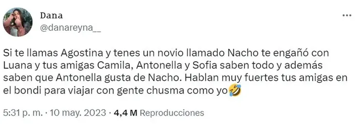 La usuaria @danareyna__ contó la situación a través de Twitter para notificar a Agostina, la novia en cuestión: "Si te llamas Agostina y tenes un novio llamado Nacho te engañó con Luana y tus amigas Camila, Antonella y Sofia saben todo y además saben que Antonella gusta de Nacho. Hablan muy fuertes tus amigas en el bondi para viajar con gente chusma como yo".