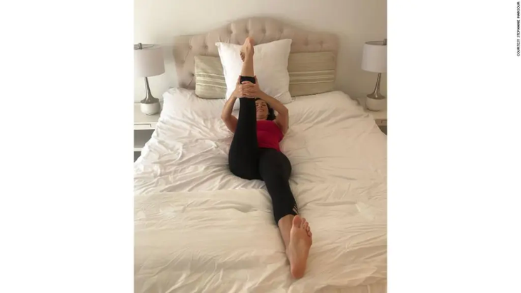 Flexioná el pie y siente el estiramiento detrás de la parte posterior de la pierna. Relajá el hombro de tu brazo derecho y asegurate de que tu espalda baja permanezca en la cama. Aguantá tres respiraciones y luego del otro lado.