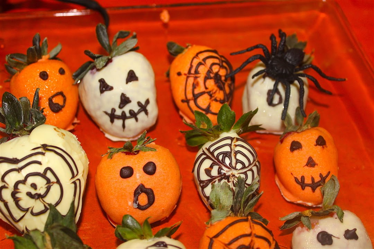 - Dejar que se enfríen y decorar invertidamente con el resto del chocolate. Las frutillas que ahora son negras, decorarlas con el chocolate naranja y viceversa. Dibuja caritas o tela de araña, no importa la prolijidad porque es Halloween y cuanto más miedo den, mejor!