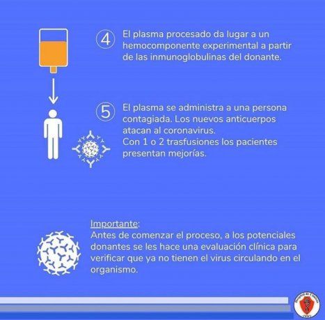 - El plasma se administra a una persona contagiada. Los nuevos anticuerpos atacan el coronavirus.