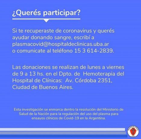 El Hospital de Clínicas José de San Martín, dependiente de la Universidad de Buenos Aires (UBA), pide a todos aquellos que se infectaron de coronavirus Covid-19 pero ya se recuperaron que donen sangre ayudar a los pacientes enfermos que todavía están siendo tratados. El procedimiento es simple, la institución se encarga de abonar el traslado de los interesados y se les ofrece un desayuno.