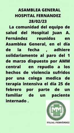 "Ante los reiterados hechos de violencia contra médicos y médicas de hospitales, Cesac y SAME, la AMM realizará un paro de 24 horas desde el miércoles 1° de marzo a las 8 hasta el jueves 2 de marzo a las 8", informó a través de sus redes sociales la Asociación y agregaron: "A los graves casos ya denunciados por nuestro gremio, se suma una brutal agresión contra una médica de la UTI del Hospital Fernández el sábado pasado. La AMM acompaña a la colega, como lo ha hecho con cada uno de sus afiliados/as".
