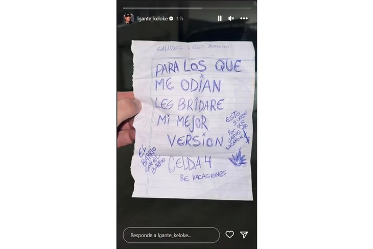 L-Gante recurrió a su cuenta de Instagram para compartir una serie de mensajes que dan cuenta de su presente y de cómo transcurren sus horas en la celda 4 del penal. En sus historias, compartió la fotografía de una hoja de cuaderno que lleva escritas, de puño y letra, varias frases.