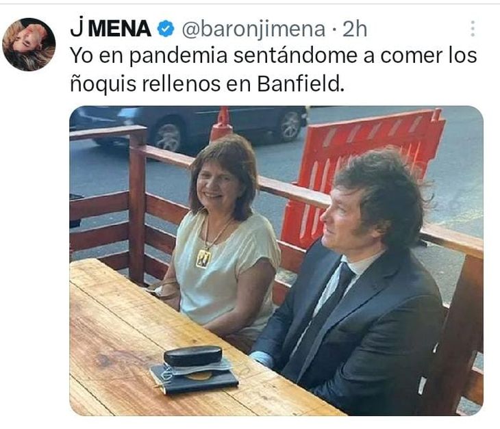 "Yo en pandemia sentándome a comer los ñoquis rellenos en Banfield", reza el texto de la imagen en la que se ve juntos pero no demasiado cómodos a Bullrich y Milei. Osvaldo, precisamente, es de esa localidad.
