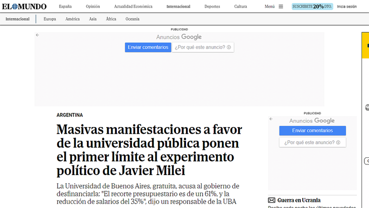 El medio español El País tiene en la portada de este miércoles de su sitio web de noticias el título: “Argentina vive una de las mayores protestas en 20 años contra la ‘motosierra’ de Milei”. "Los recortes a la universidad pública son el detonante de manifestaciones masivas en todo el país austral, reflejo de un creciente malestar social hacia la política económica", señala el diario de España. Además, en la nota de tapa analiza que esta masiva movilización de alcance nacional es un punto de inflexión en el gobierno del libertario.