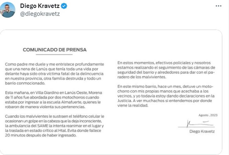 El actual intendente de Lanús y precandidato a Gobernador de la provincia de Buenos Aires, Néstor Grindetti, envió sus condolencias a la familia de Morena en su cuenta de Twitter y lamentó otro nuevo hecho delictivo acompañando el posteo del precandidato a Jefe Comunal del mismo municipio, Diego Kravetz: "Otro lamentable hecho de inseguridad que nos conmociona y nos entristece terriblemente. Mi acompañamiento a la familia de Morena. Está todo el equipo de seguridad de @lanusmunicipio trabajando para dar con los responsables".