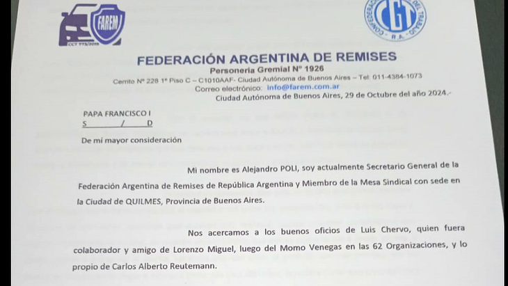 Según el texto al que accedió este medio, Poli invitó al sumo pontífice a recorrer el sur del conurbano bonaerense por dos motivos: para que conozca el trabajo en las cinco clínicas de salud de los remiseros y para encabezar un “encuentro” entre trabajadores, empresarios, fuerzas vivas, movimientos desplazados y sindicatos.