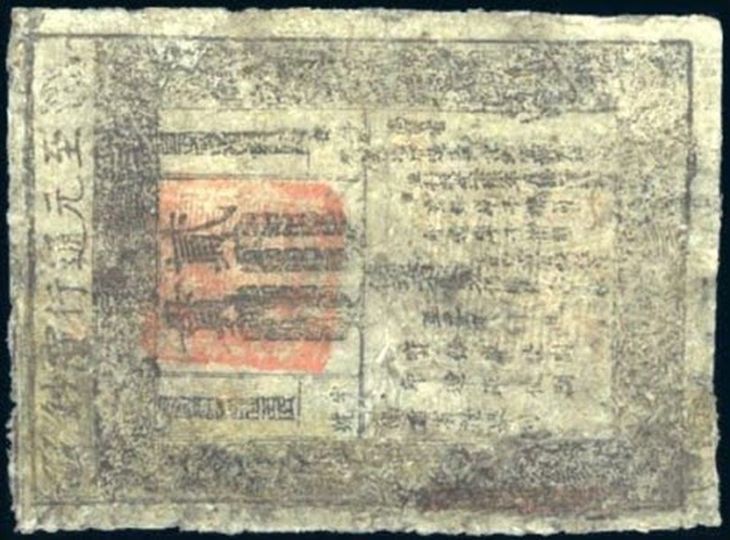 Data del siglo XIV y procede de China. Teniendo en cuenta que en Europa no se utilizó el papel moneda hasta el siglo XV, parece increíble que todavía se conserve.