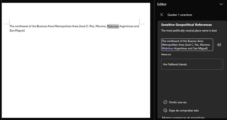 Al ingresar, nos menciona (en inglés) que “el nombre más políticamente neutral es el más conveniente”, señalándonos como problemático nada más y nada menos que el nombre “Malvinas”, el cual, dicho sea de paso, estaba siendo utilizado en el escrito para nombrar una localidad del conurbano bonaerense donde viven más de 350 mil personas: Malvinas Argentinas. Pero no solo eso, sino que el corrector acerca una sugerencia de cuál sería ese “nombre más políticamente neutral” y por tanto “más conveniente”: “The Falkland Islands”.