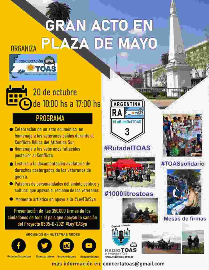 El acto se enmarca dentro de una batería de actividades que Concertación TOAS llevó adelante a lo largo del año. Entre marzo y abril pasado, por ejemplo, con motivo de los 39 años de la guerra de Malvinas, la agrupación realizó "La ruta del TOAS", una caravana de más de 2.000 kilómetros que unió los escenarios patagónicos del conflicto, desde Puerto Madryn hasta Ushuaia, región donde estaban apostadas las principales bases aeronavales.