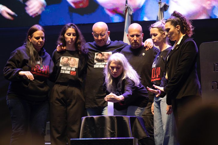 El embajador israelí en la Argentina, Eyal Sela, estuvo presente en el evento, al igual que familiares de personas que siguen secuestradas. Subieron al escenario con fotos de sus seres queridos para encender una vela y acompañar el minuto de silencio.