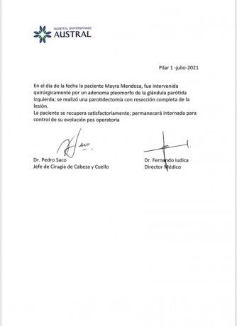 Durante el miércoles, había informado que se iba a someter a una cirugía en su cuenta personal de Twitter. “Quiero contarles a mis vecinos y vecinas de Quilmes que mañana jueves seré intervenida quirúrgicamente para extirpar un adenoma pleomorfo de la glándula parótida izquierda”, expresó Mendoza.