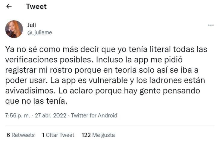 “Yo tenía Mercado Pago en mi celular y de hecho, lo usaba bastante. Tenía tarjetas asociadas de crédito y débito y plata en la cuenta. A mí me robaron el celular IPhone XR el pasado jueves, que no tiene huella, tiene reconocimiento facial y clave numérica. Yo tenía todas las condiciones de seguridad activadas; quiero que eso quede claro porque en Twitter me están diciendo que es imposible que entren a la app sin las claves. Yo misma usaba Mercado Pago y me pedía mi reconocimiento facial. La app es vulnerable”, le contó inicialmente Julia a Ámbito.