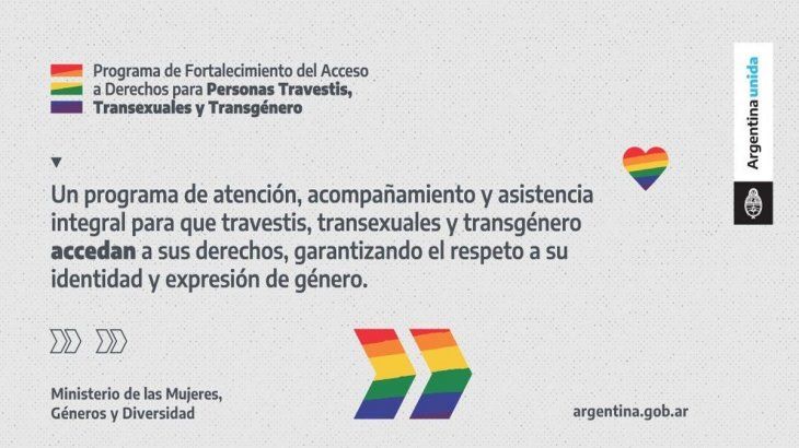 Tiene el objetivo de asegurar el respeto de su identidad y expresión de género, que se articula con otros organismos a nivel nacional, provincial y municipal y organizaciones a través de una atención, acompañamiento y asistencia integral.