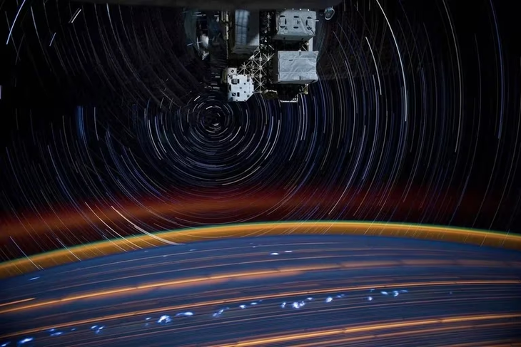 Esta foto muestra el brillo del aire atmosférico (en color verde lima), las ciudades que pasan desde el movimiento orbital, las tormentas relámpagos parpadeando y los senderos de estrellas.