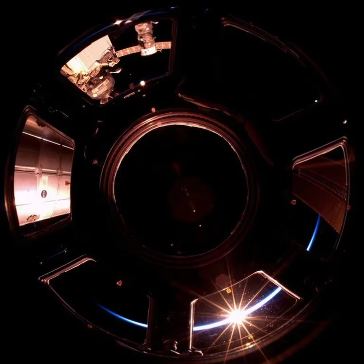 La foto es una puesta del sol en órbita tomada desde las ventanas de la Estación Espacial Internacional Cúpula con lente de ojo de pez.