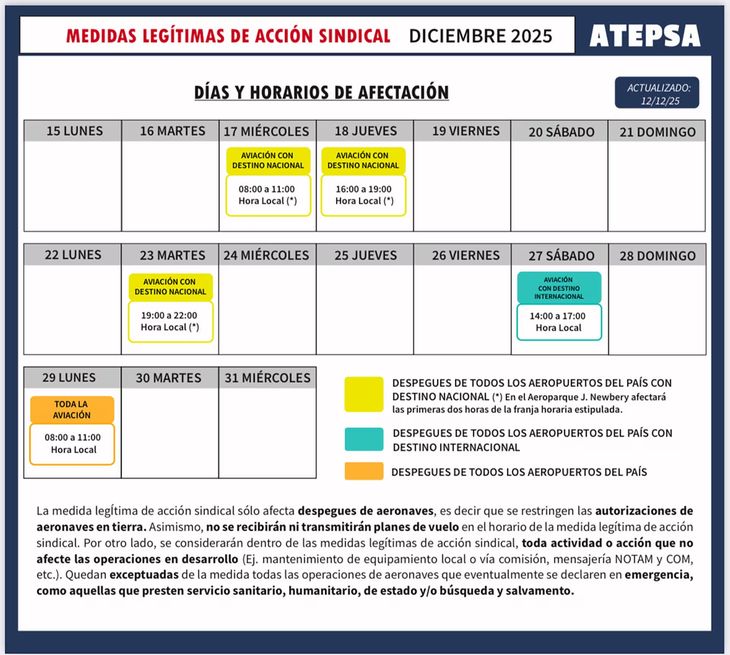 El gremio aclaró que las medidas afectarán únicamente los despegues, con restricción de autorizaciones en tierra y sin transmisión de planes de vuelo durante los horarios de paro. Quedarán exceptuadas las operaciones de emergencia, sanitarias, humanitarias, de Estado y de búsqueda y salvamento.