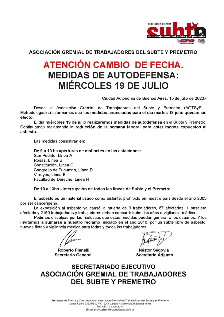 Los dirigentes de la Asociación Gremial de Trabajadores del Subte y el Premetro (AGTSyP) anunciaron un paro total del servicio para el próximo miércoles 19 de julio de 10 a 13 horas en reclamo de la presencia de asbesto en las formaciones y estaciones de la red y por una reducción de la jornada laboral.
