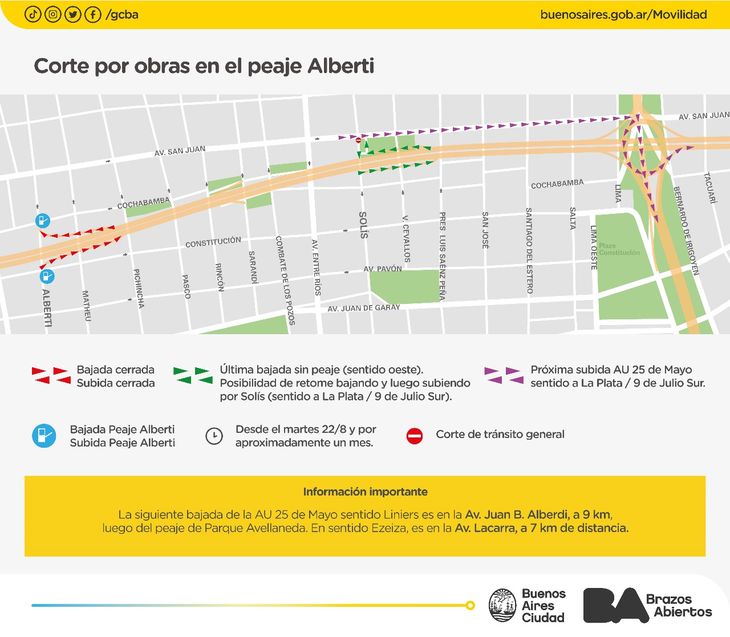 Para quienes utilizaban la subida del peaje, sentido centro, podrán ingresar a la AU 25 de Mayo por la subida de San Juan por el Distribuidor 9 de Julio. A su vez, se mantiene el corte total en Solís, para que la subida sea para retomar.
