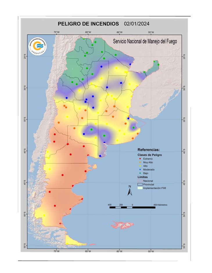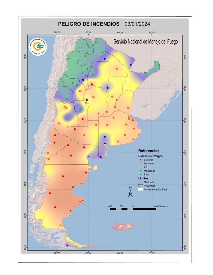 En la web del SMN puede encontrarse el índice de peligro de incendio expresado en mapas de la Argentina del día actual, así como también una proyección a 24 horas, otra a 48 y una más a 72, todas en mapas con las escalas de los colores mencionados.