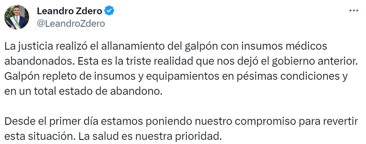 El gobernador Zdero había notificado el miércoles desde sus redes sociales, que en la ciudad de Resistencia "la justicia realizó el allanamiento del galpón con insumos médicos abandonados".