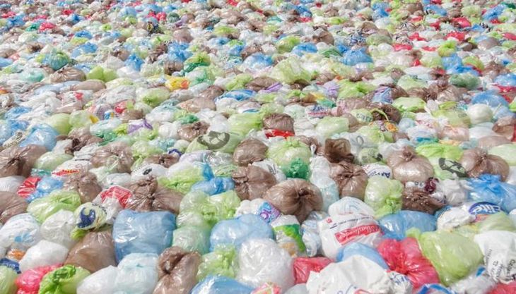 Miles de bolsas plásticas de un solo uso crean un mosaico multicolor en el monumento histórico. Conocé el mensaje y la importancia de la intervención.