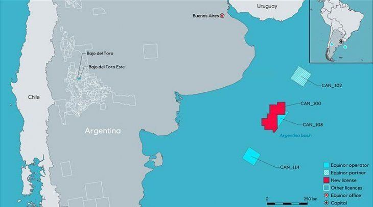 En el bloque CAN 114, ubicado a a 443 km de Mar del Plata, comparte la sociedad total en partes iguales con la compañía de mayoría estatal. Equinor e YPF son socios además en el bloques CAN 102, que todavía no tiene permiso de exploración.