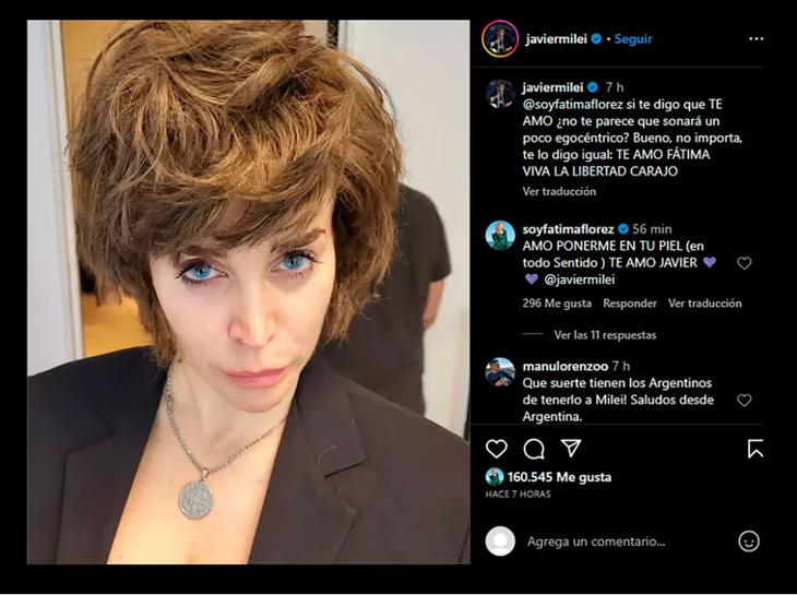 "Si te digo que te amo, ¿no te parece que sonará un poco egocéntrico? Bueno, no importa, te lo digo igual. Te amo Fátima. Viva la libertad, carajo", escribió Milei junto al posteo en el que se observa a la imitadora con una peluca similar al cabello del economista y lentes de contacto celestes en sus ojos.