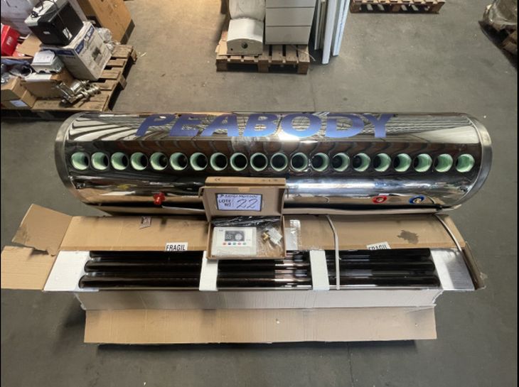 Termotanque: una de las ofertas imperdibles es el termotanque Peabody, el cual se encuentra en el lote 22. Se trata de un termotanque solar en inoxidable Peabody, modelo Tsm 200, con 20 tubos colectores, con controlador solar Tkadz, modelo tk-8a, y con medidas de 1730 x 450 de diámetro.