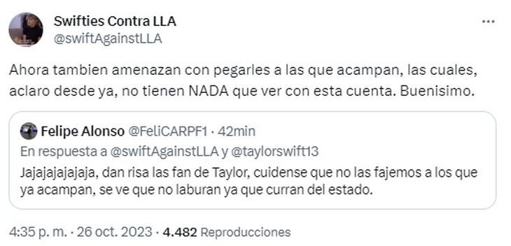 Un defensor de LLA sostuvo en su cuenta de Twitter: "Dan risa las fans de Taylor, cuídense que no las fajemos a las que ya acampan, se que ve que no laburan ya que curran del Estado", amenazó @FeliCARPF1.