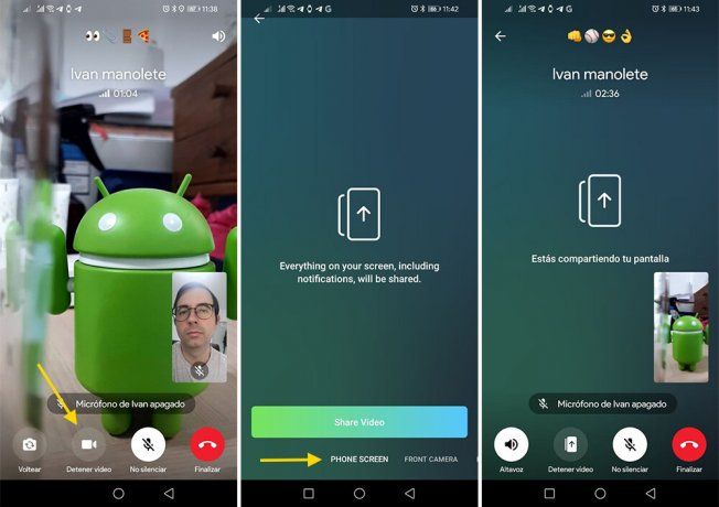Para compartir pantalla desde tu ordenador o celular con la versión beta, debés iniciar una llamada, luego detener el vídeo, luego volver a activarlo y verás que aparece un selector entre cámara frontal, cámara trasera y pantalla del teléfono.