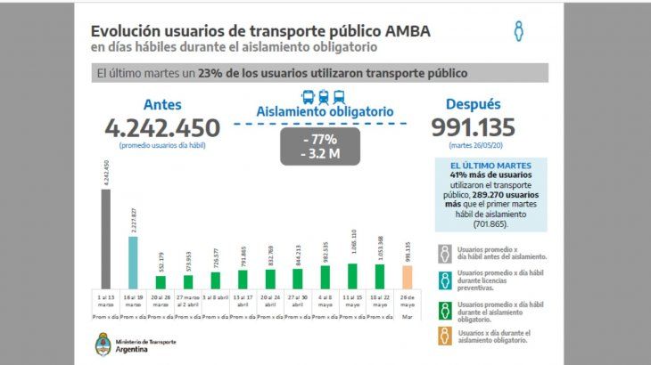 El último fin de semana largo registró 457.272 usuarios de transporte público de pasajeros en el país, lo que significó un incremento del 45% con respecto al primer fin de semana del aislamiento social, preventivo y obligatorio por la pandemia de coronavirus Covid-19.